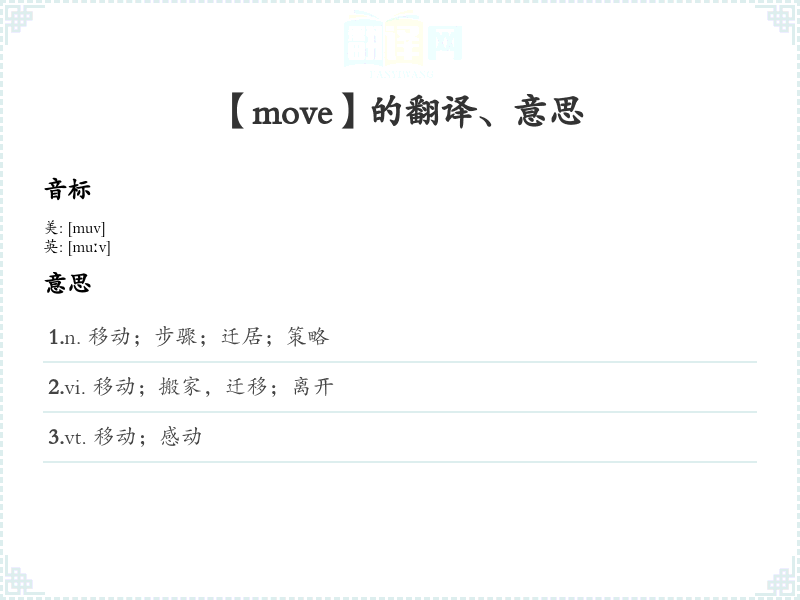 2.vi. 移动;搬家,迁移;离开 3.vt. 移动;感动