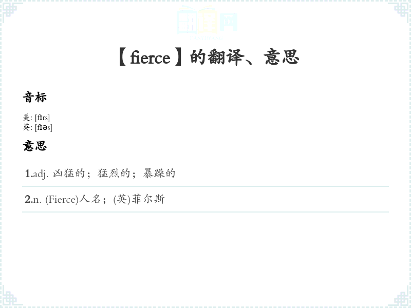 1.adj. 凶猛的;猛烈的;暴躁的 2.n. (Fierce)人名;(英)菲尔斯