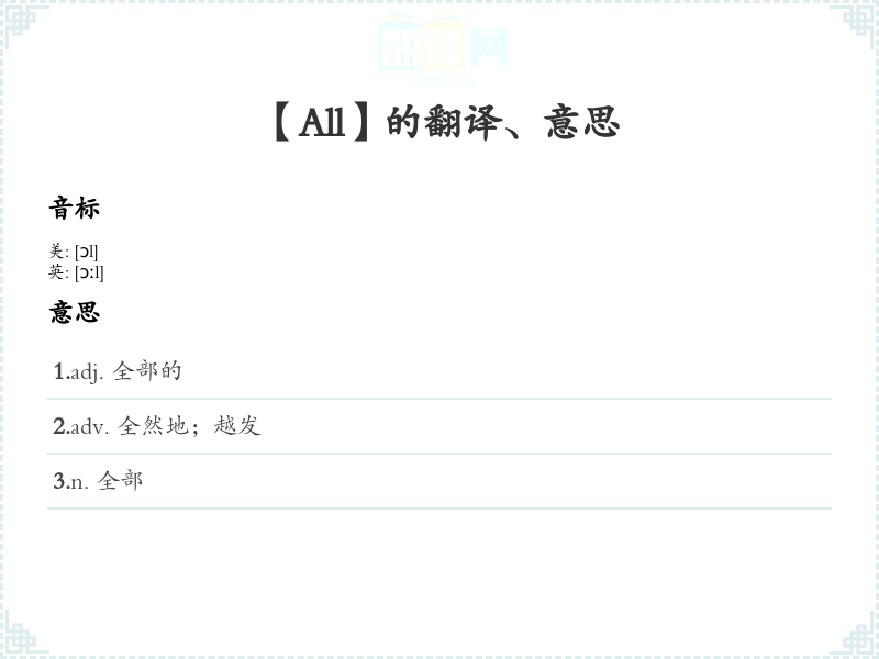 - 字面意思: “All”这个单词的字面含义是“全部的”或者“所有的”,用来表示一个整体或每一个部分。