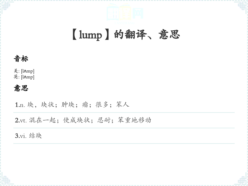 - 字面意思:Lump指的是一个大而无规则形状的物体,通常是固体。它可以指一块物质(如糖、石头等),或者也可以用作比喻,指代某种情感或状态。