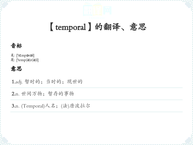- 在科学(如物理学)中,常用来描述时间维度或时间范围。例如:“temporal dimensions”(时间维度)。