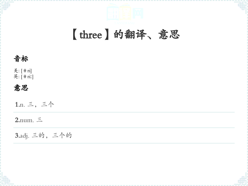 - “three”源自古英语“þrēo”,而其更早的来源是原始印欧语的“*treyes”,表示“三”的概念。它没有前缀或后缀,直接表示数字。
