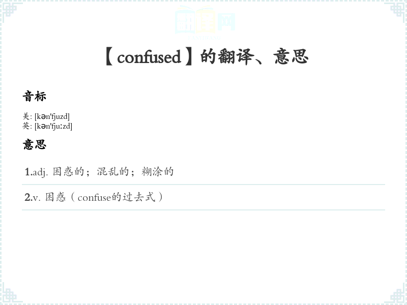 1.adj. 困惑的;混乱的;糊涂的 2.v. 困惑(confuse的过去式)