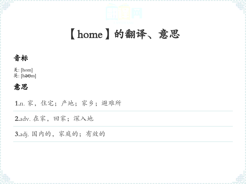 - 字面意思:字面上,“home”指的是一个人或动物的居住地点,通常是一个家庭或住所。定义为“一个人生活的地方,通常是指家庭或具有安全感的地方”。