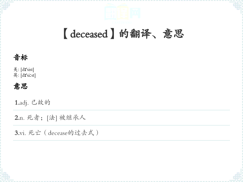 2.n. 死者;[法] 被继承人 3.vi. 死亡(decease的过去式)