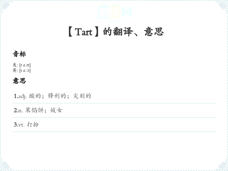 - 字面意思:Tart指的是一种带有酸味的食物,尤其是指一种用水果或其他馅料做成的糕点或派。引申义上,它也可以用来形容某种尖锐或刻*的言辞。