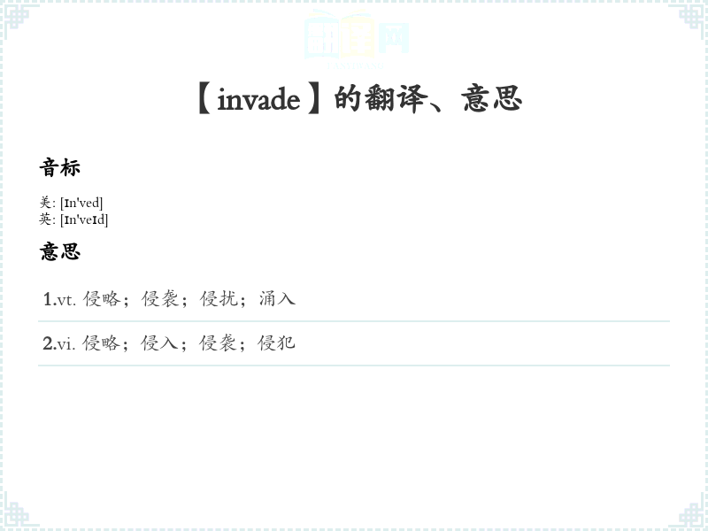 - 字面意思:动词“invade”字面意思为“侵入、侵略”,指的是进入一个地方以占领或控制。