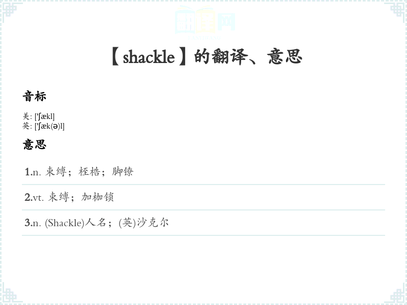 2.vt. 束缚;加枷锁 3.n. (Shackle)人名;(英)沙克尔