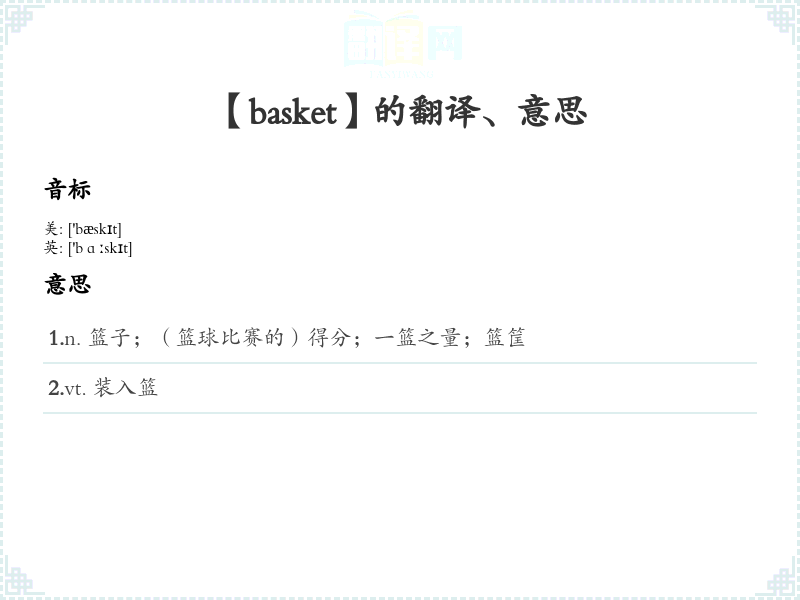 - 通过音标记忆发音 /ˈbæskɪt/,可以将单词分解为“bas”和“ket”,联想为“基座上的小物品”,帮助记忆。