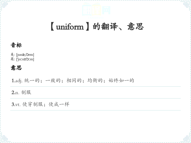 通过上述分析及示例,"uniform" 这个词汇在不同语境中有多种用法,掌握这些用法将有助于更好地理解和运用该词。
