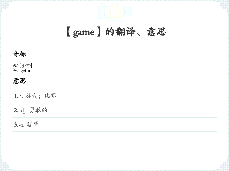 - 通过音标将“game”与类似发音的词汇联系起来,例如“fame”(名声),有助于记忆。