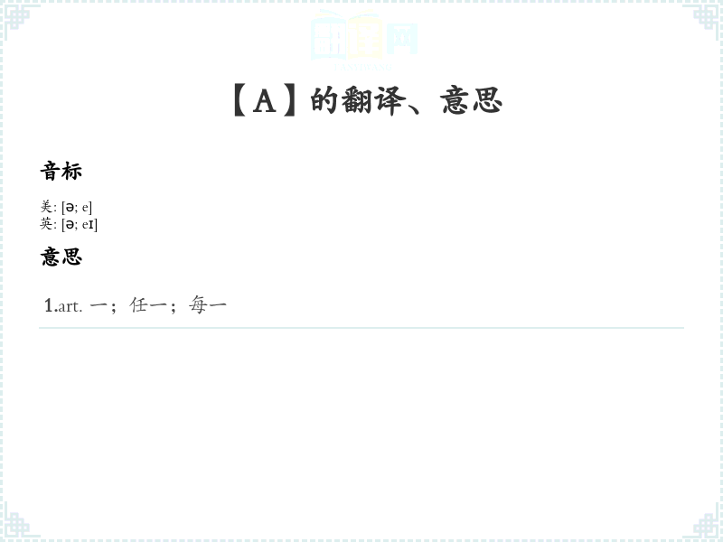 - 词性:在英语中,“A” 作为冠词使用(不定冠词),也可以作为名词(如字母A)。