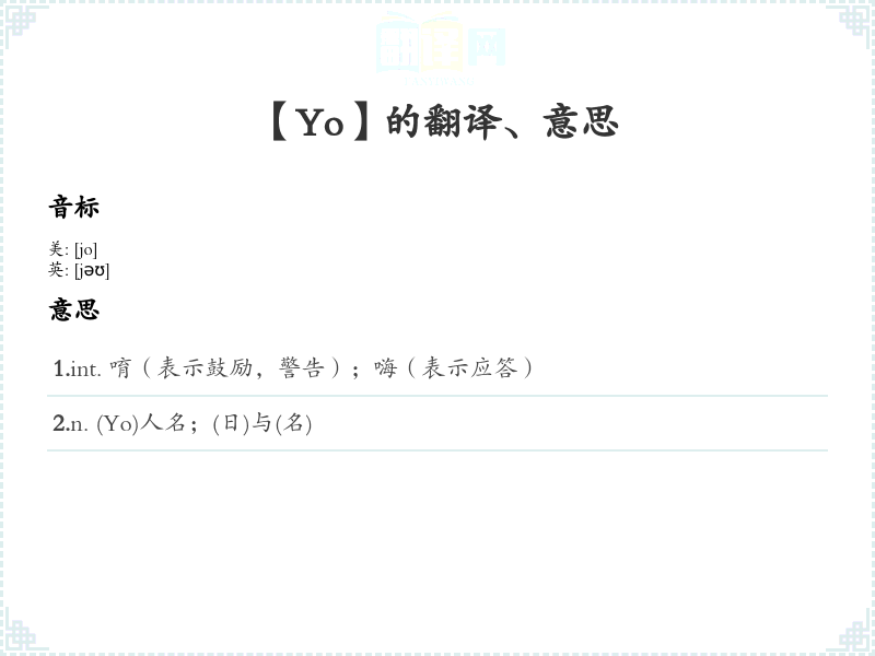 1.int. 唷(表示鼓励,警告);嗨(表示应答) 2.n. (Yo)人名;(日)与(名)