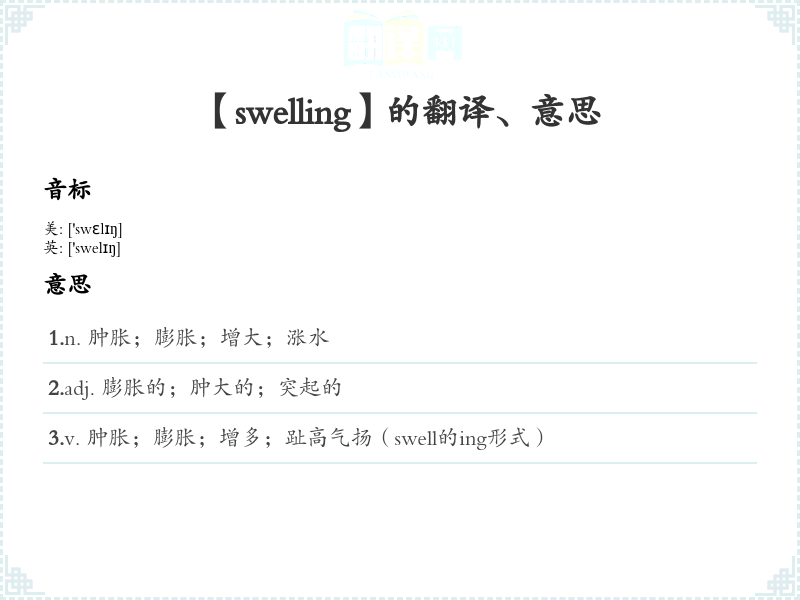 - 词性:名词(n.),也可以作为动词“swell”的现在分词(v.)。