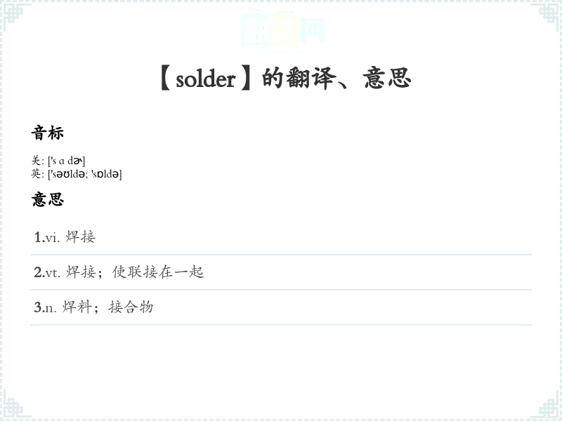 - 音标记忆法:solder 的音标为 /ˈsɒdər/,可以通过反复朗读和书写来加深记忆。