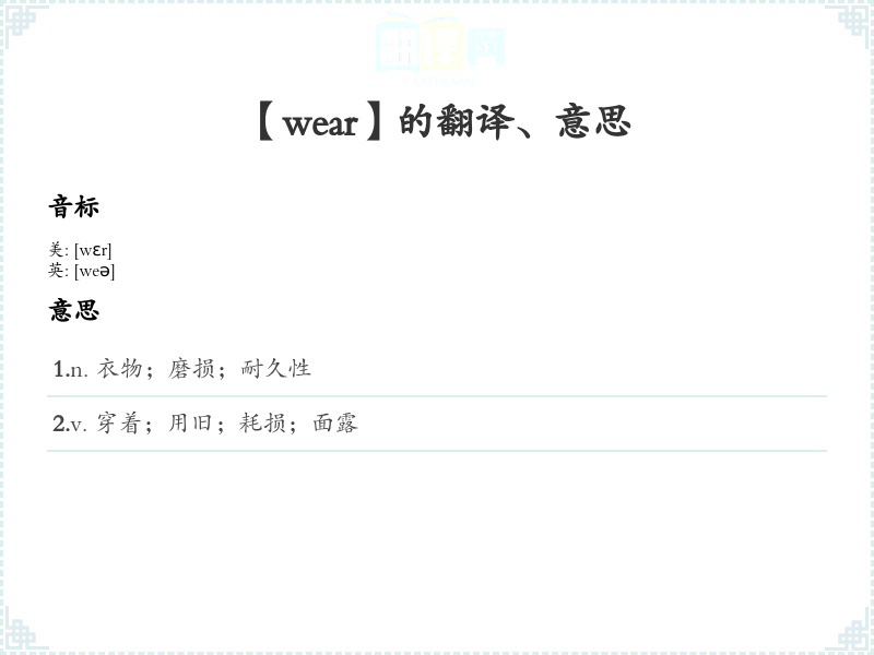 - 定义:作为动词时,"wear" 指的是穿戴衣物或使用饰品;作为名词时,"wear" 指的是磨损或损耗的状态。