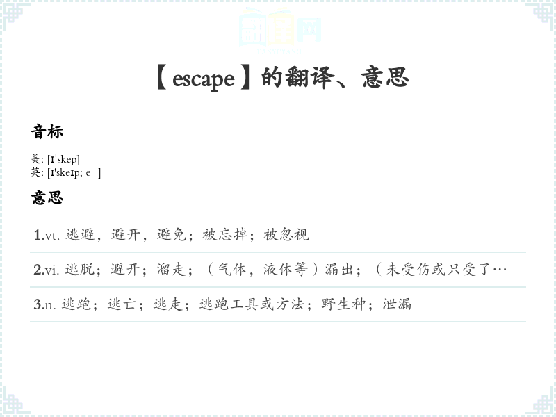 2.vi. 逃脱;避开;溜走;(气体,液体等)漏出;(未受伤或只受了一点伤害而)逃脱;声音(不自觉地)由…发出 3.n. 逃跑;逃亡;逃走;逃跑工具或方法;野生种;泄漏