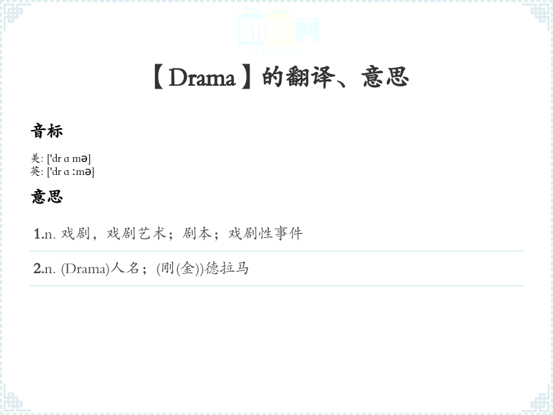 1.n. 戏剧,戏剧艺术;剧本;戏剧性事件 2.n. (Drama)人名;(刚(金))德拉马