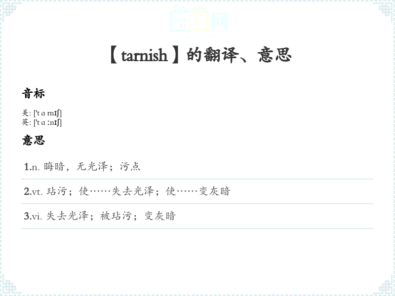 - 词性:动词(to tarnish),名词(tarnish)。