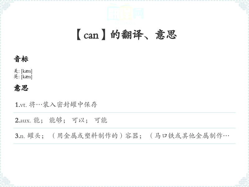2.aux. 能; 能够; 可以; 可能 3.n. 罐头; (用金属或塑料制作的)容器; (马口铁或其他金属制作的)食品罐头