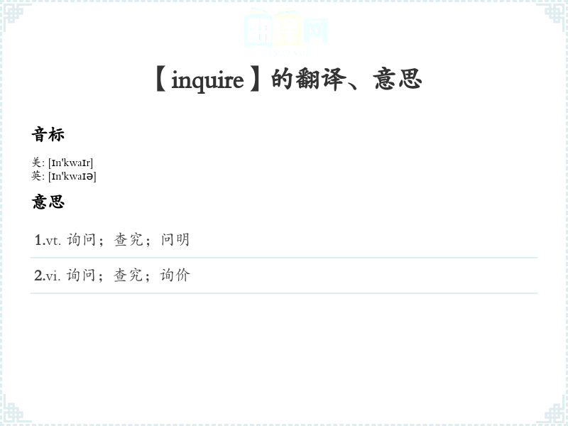 1.vt. 询问;查究;问明 2.vi. 询问;查究;询价