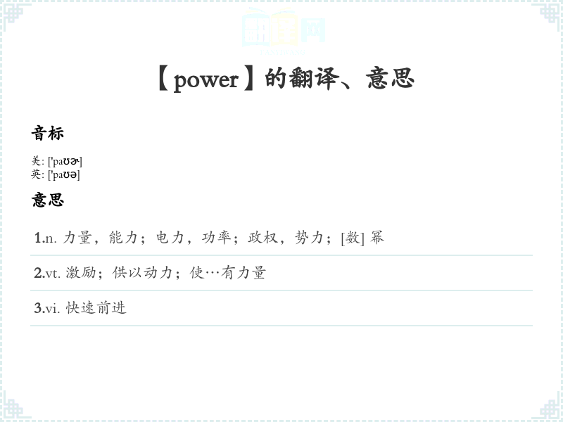 1.n. 力量,能力;电力,功率;政权,势力;[数] 幂