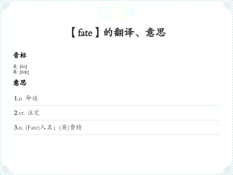 2.vt. 注定 3.n. (Fate)人名;(英)费特