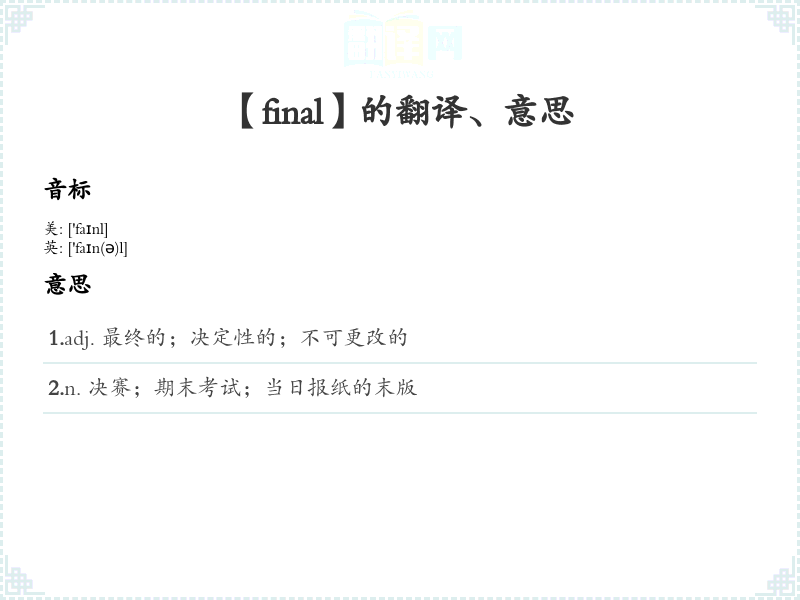 - 字面意思:单词“final”表示“最后的”或“最终的”,通常用于指代某个过程、**或事物的结局或终点。