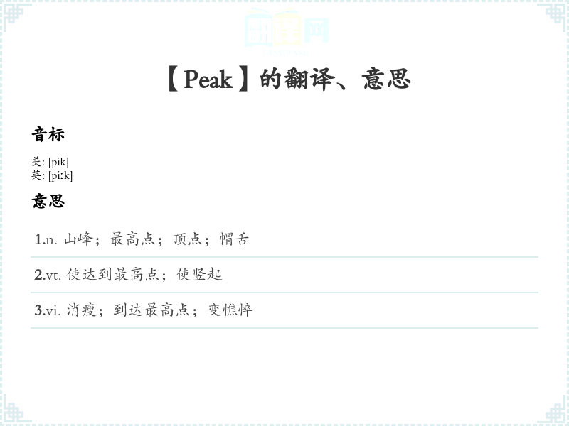 4.adj. 最高的;最大值的 5.n. (Peak)人名;(英)皮克