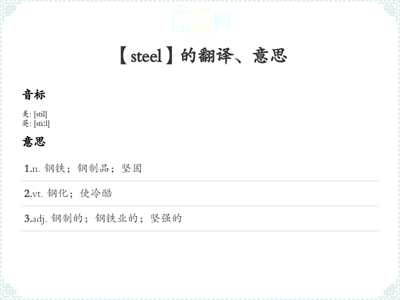 3.adj. 钢制的;钢铁业的;坚强的 4.n. (Steel)人名;(德)施特尔;(英)斯蒂尔