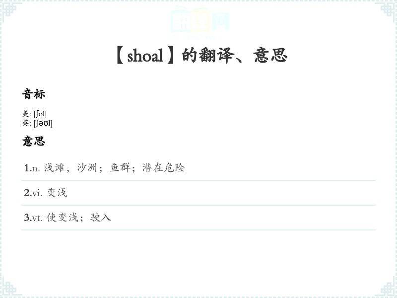 - 反义词:Deep, abyss, depth。“Deep”指的是水域的深度,完全与“shoal”相反。