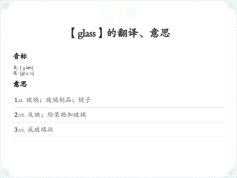 - 字面意思:Glass指的是一种透明的固体材料,通常用于制造窗户、容器等。它的定义为“一种无定形的硬性物质,通常由二氧化硅制成,能够通过光线”。