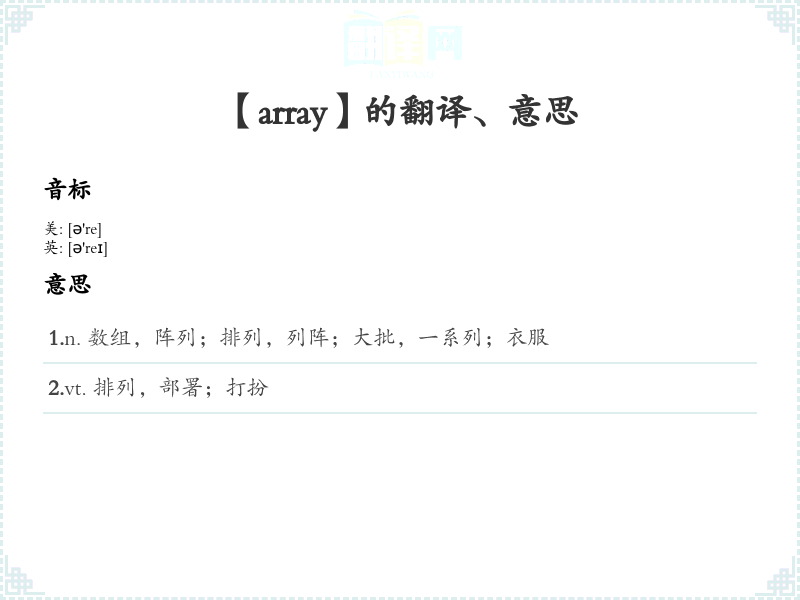 1.n. 数组,阵列;排列,列阵;大批,一系列;衣服 2.vt. 排列,部署;打扮