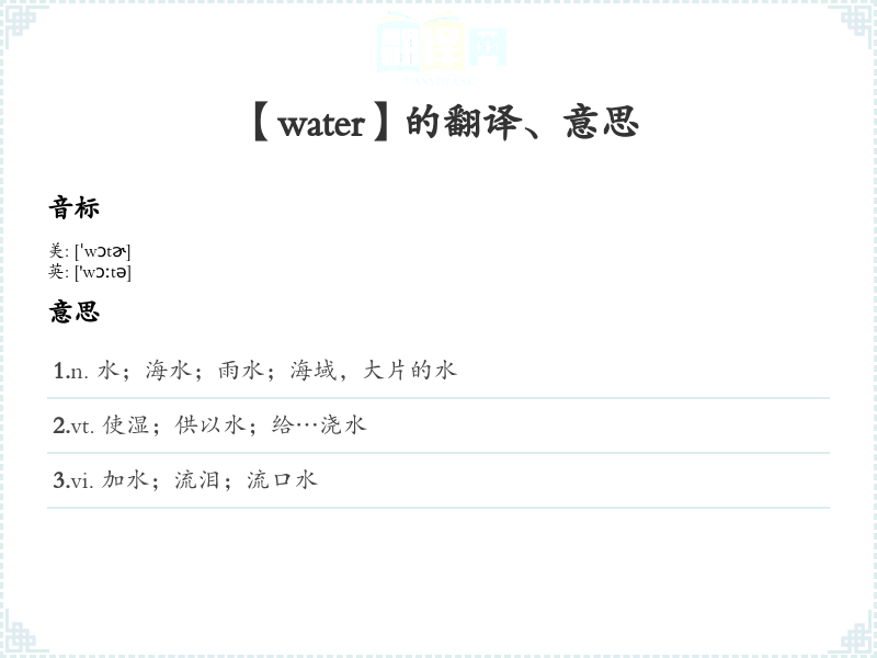 这些信息可以帮助学*者更好地理解和使用“water”这个词。