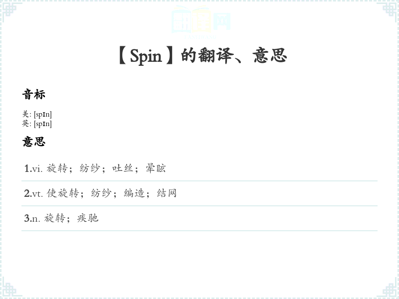 - 谐音联想记忆:可以将“spin”联想为“神奇的旋转”,帮助记住这个词的含义。
