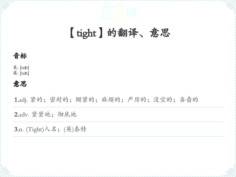 - 字面意思:tight的字面含义是“紧的”或“牢固的”,指物体的固定状态,不能轻易移动或松开。