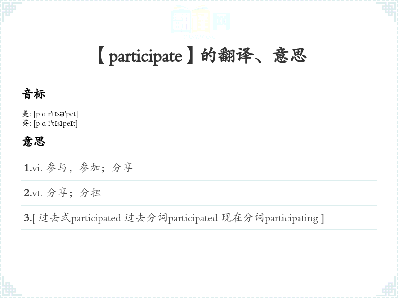 2.vt. 分享;分担 3.[ 过去式participated 过去分词participated 现在分词participating ]