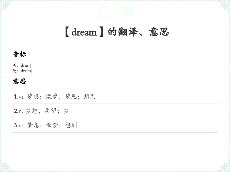 3.vt. 梦想;做梦;想到 4.adj. 梦的;理想的;不切实际的