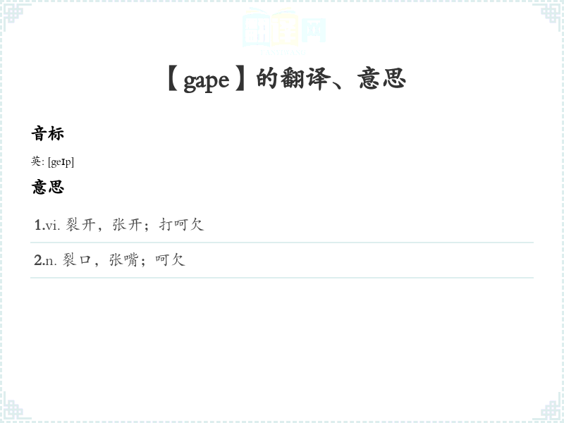 - 音标记忆法:gape [ɡeɪp],可以将其与“gate”(门)联想,想象一个人因看到打开的门而目瞪口呆。