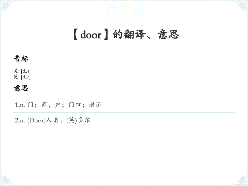 1.n. 门;家,户;门口;通道 2.n. (Door)人名;(英)多尔