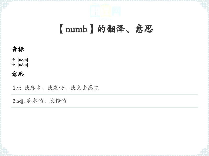 1.vt. 使麻木;使发愣;使失去感觉 2.adj. 麻木的;发愣的