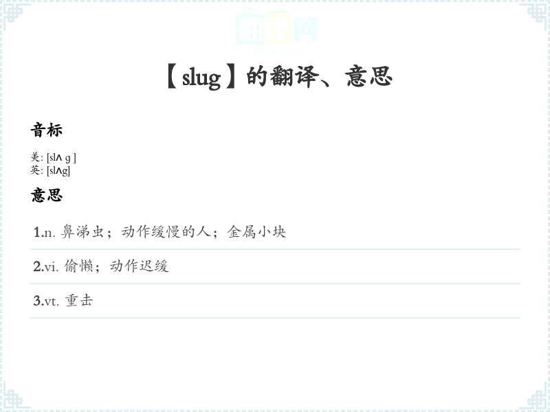- 音标记忆法:可以通过音标/slʌg/来帮助记忆,注意发音的短促和清晰,联想“慢慢爬行”的形象。