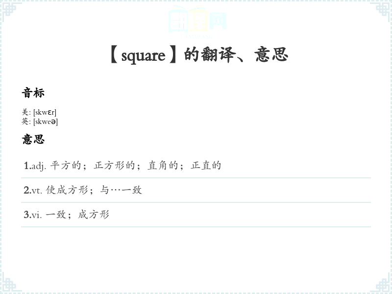4.n. 平方;广场;正方形 5.adv. 成直角地