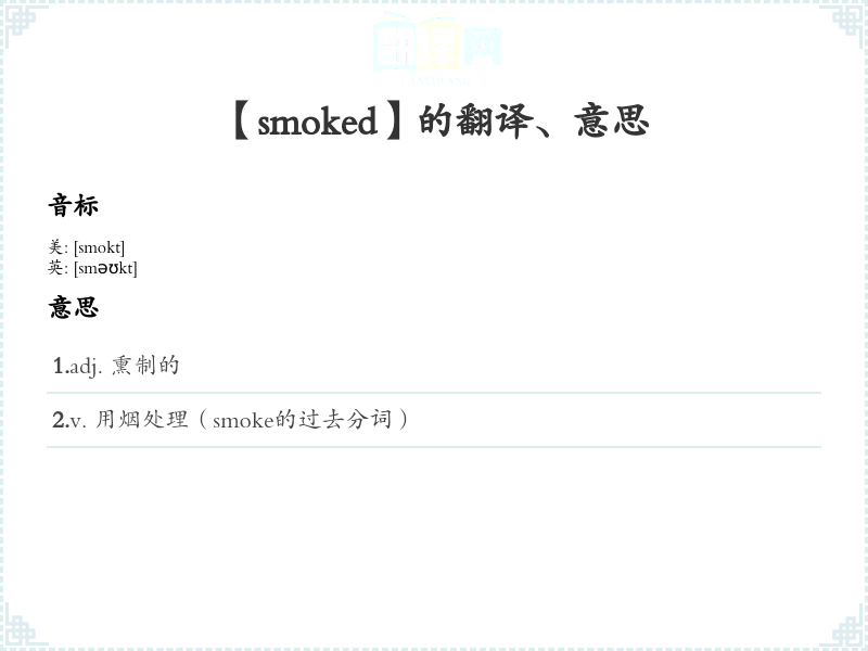 - 字面意思:‘smoked’ 是动词 ‘smoke’ 的过去分词,指用烟熏制食物或物体,也可指吸烟的状态。基本定义为:用烟熏制或处理。
