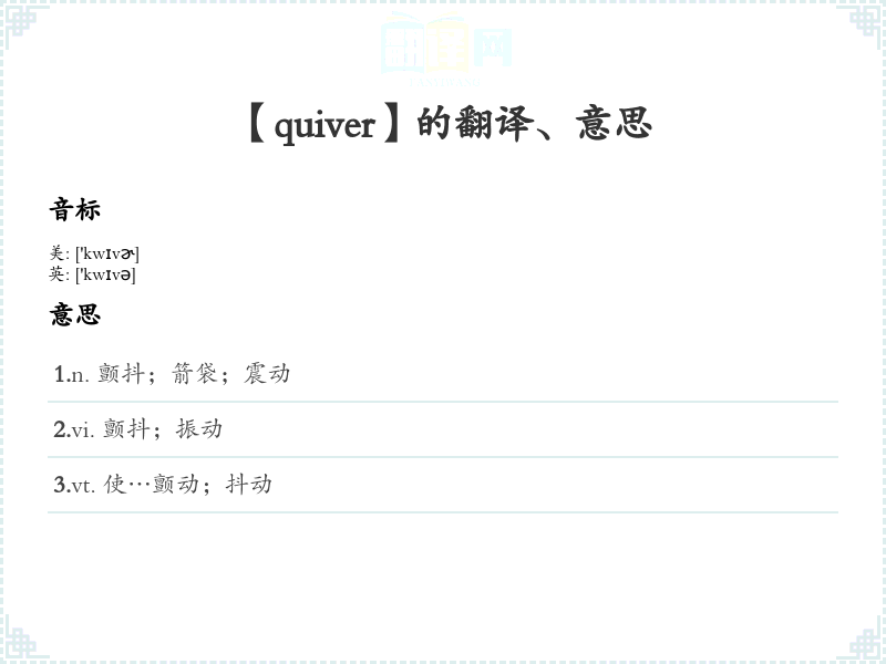 - 字面意思:Quiver的字面含义是“颤动”或“颤抖”,通常指由于情感(如恐惧、激动)或寒冷而引起的轻微颤动。