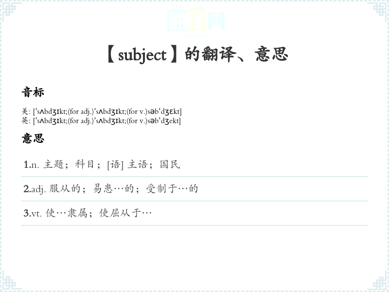 - 字面意思:该单词“subject”字面上指的是被讨论或研究的主题、对象或课题。其清晰的定义是“一个讨论、研究或分析的主题或对象”。