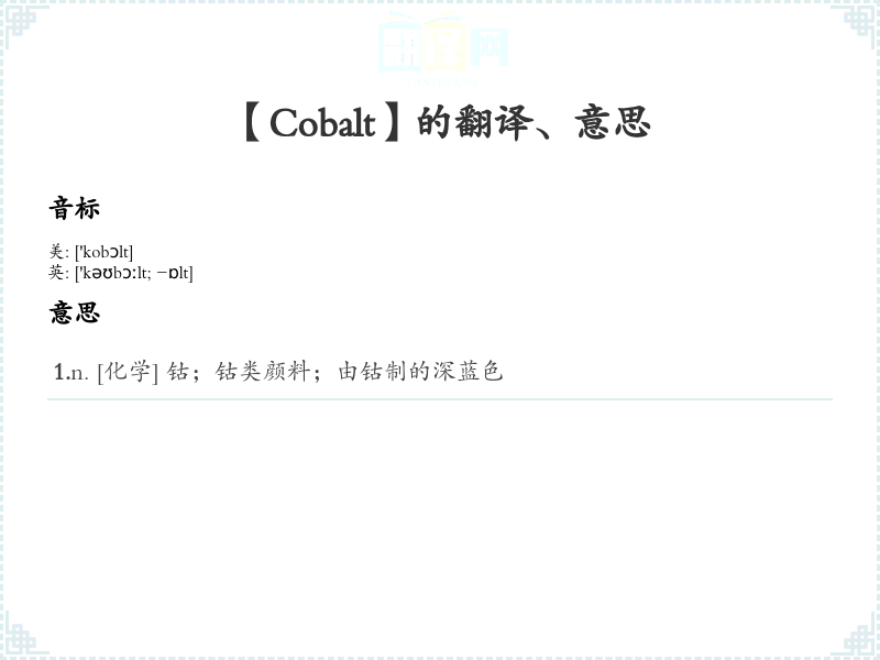 - 字面意思:Cobalt is a chemical element with the symbol Co and atomic number 27. It is a hard, lustrous, silver-gray metal used in various applications, including batteries, catalysts, and pigments.