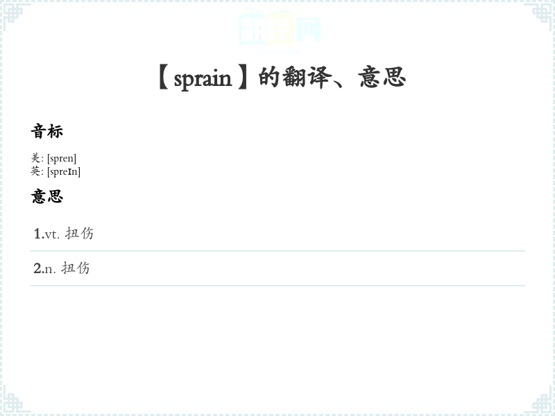 - 词性:动词(to sprain)和名词(a sprain)。