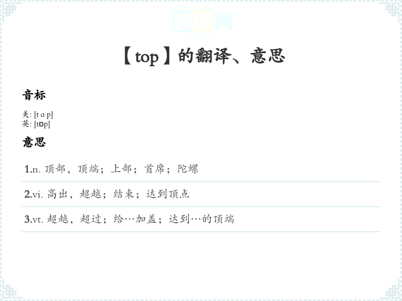 top的字面含义是“顶部”或“最高点”,指某物的最上面部分。 - 词性:名词、动词、形容词。