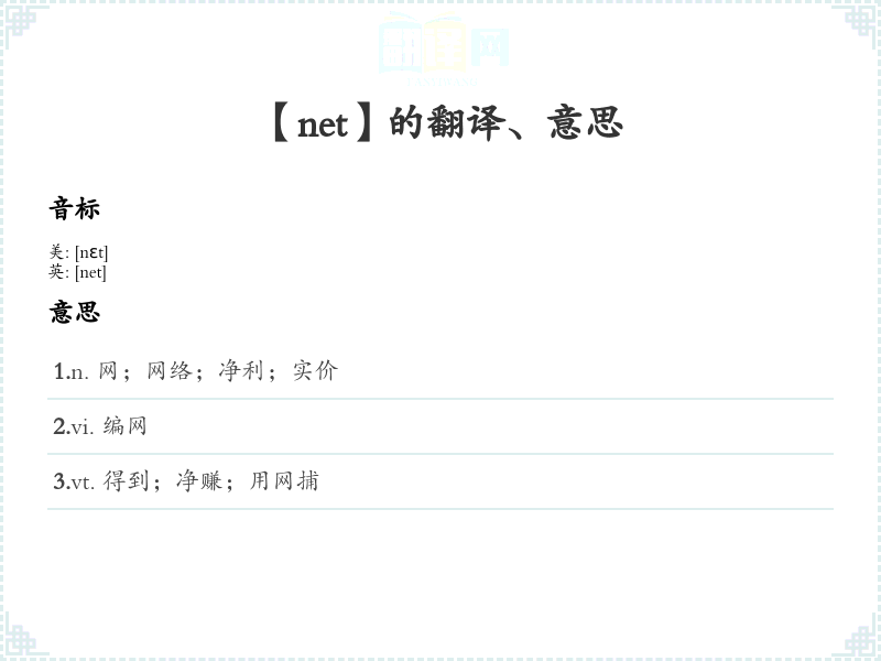 通过上述分析,可以全面理解“net”这个单词的含义、用法及相关知识,有助于更好地掌握和运用该词。